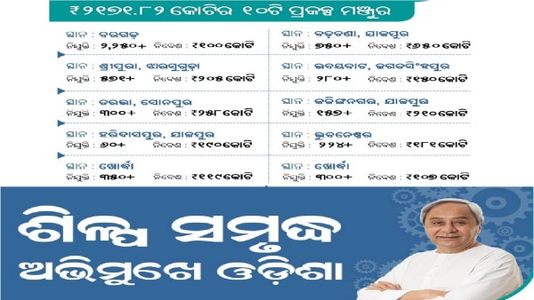 ଏନେଇ ଟ୍ବିଟ କରି ଖୁସି ଜାହିର କରିଛନ୍ତି ମୁଖ୍ୟମନ୍ତ୍ରୀ ନବୀନ ପଟ୍ଟନାୟକ । ଏହି ୧୦ଟି ପ୍ରକଳ୍ପ ଦ୍ୱାରା ୫ ହଜାର ୨୪୨ ନିଯୁକ୍ତି ସୁଯୋଗ ସୃଷ୍ଟି ହେବ । ପ୍ରକଳ୍ପ ଗୁଡିକ ଶିଳ୍ପ ସମୃଦ୍ଧ ଧାରାକୁ ଆହୁରି ତ୍ୱରାନ୍ୱିତ କରିବ ବୋଲି କହିଛନ୍ତି ମୁଖ୍ୟମନ୍ତ୍ରୀ ।