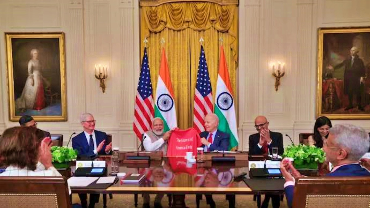 ନୂଆଦିଲ୍ଲୀ: ଶୁକ୍ରବାର ଦିନ ଯୁକ୍ତରାଷ୍ଟ୍ର ଆମେରିକାର ରାଷ୍ଟ୍ରପତି ଜୋ ବାଇଡେନ୍ ପ୍ରଧାନମନ୍ତ୍ରୀ ନରେନ୍ଦ୍ର ମୋଦିଙ୍କୁ ଗୋଟାଏ ବିଶେଷ 'ଟି-ସାର୍ଟ' ଉପହାର ଦେଇଛନ୍ତି । ଯେଉଁଥିରେ ଲେଖାଅଛି 'ଦି ଫ୍ୟୁଚର୍ ଇଜ୍ ଏଆଇ- ଆମେରିକା ଆଣ୍ଡ୍ ଇଣ୍ଡିଆ'। ଏହାର ଅର୍ଥ କଣ, ଆସନ୍ତୁ ଜାଣିବା....