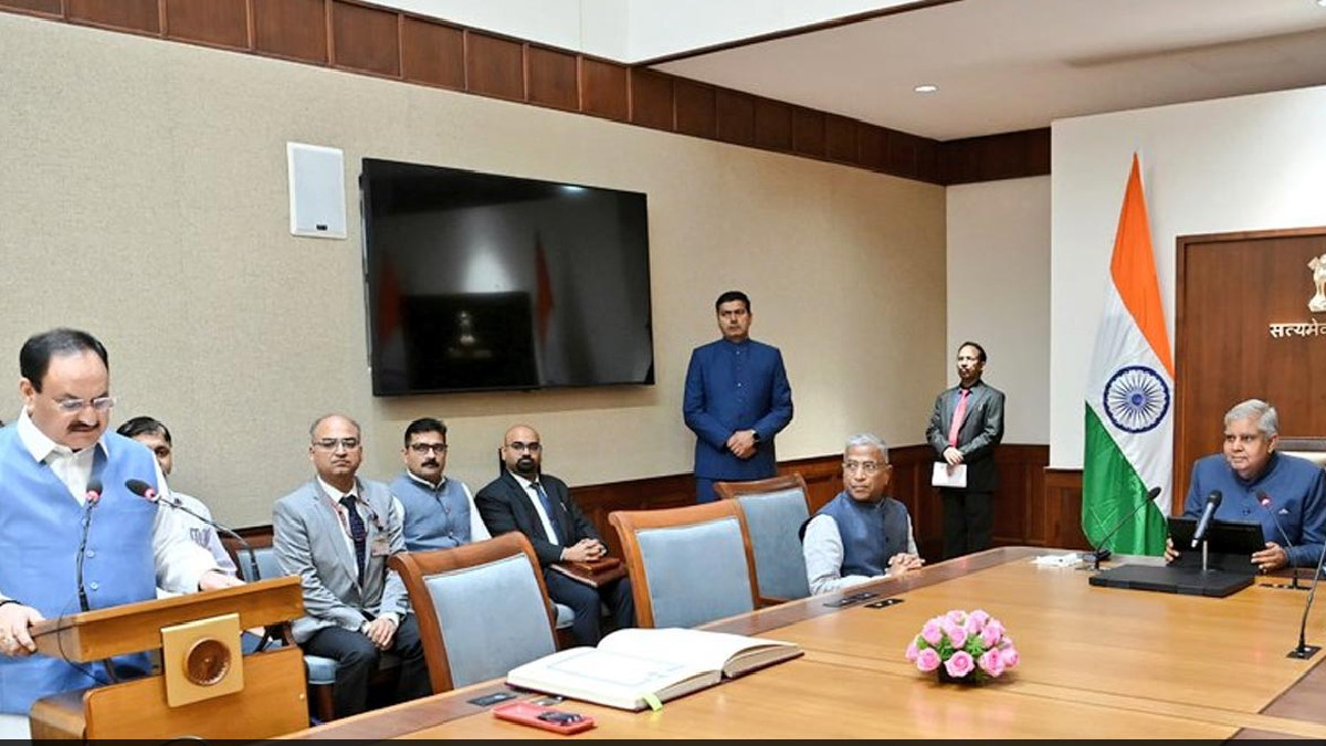 Hon'ble Vice-President of India & Chairman, Rajya Sabha, Shri Jagdeep Dhankhar administered oath to Shri Jagat Prakash Narayan Lal Nadda ji as the elected Member of Rajya Sabha in Parliament House today. @JPNadda pic.twitter.com/D9qLw6Hl4x