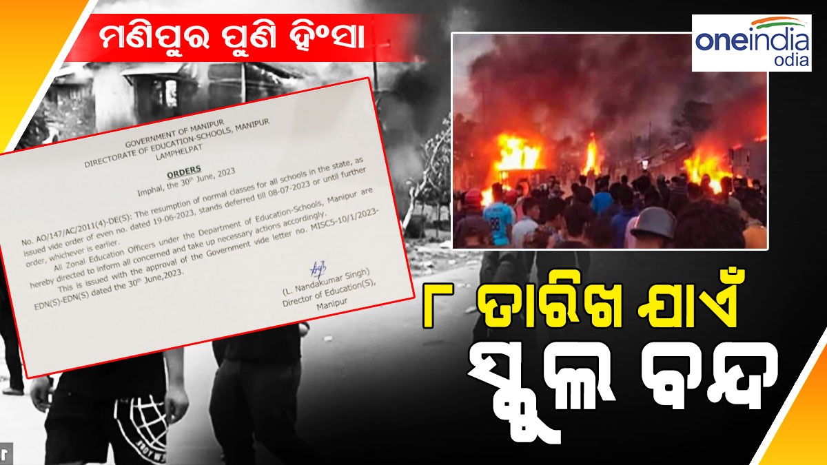 ଜାତିଗତ ହିଂସା ହେତୁ ମଣିପୁରରେ ଗତ କିଛି ଦିନ ହେବ ଉତ୍ତେଜନା ଲାଗି ରହିଛି । ମେ ମାସ ଆରମ୍ଭରୁ ଆରମ୍ଭ ହୋଇଥିବା ହିଂସା ବନ୍ଦ ହେବାର ନାମ ନେଉନାହିଁ । ହିଂସା କାରଣରୁ ରାଜ୍ୟରେ ଅଶାନ୍ତି ଓ ଉତ୍ତେଜନା ବ୍ୟାପିଥିବାରୁ ରାଜ୍ୟ ସରକାର ଜୁଲାଇ 8 ପର୍ଯ୍ୟନ୍ତ ସମସ୍ତ ବିଦ୍ୟାଳୟ ବନ୍ଦ କରିବାକୁ ନିର୍ଦ୍ଦେଶ ଦେଇଛନ୍ତି ।