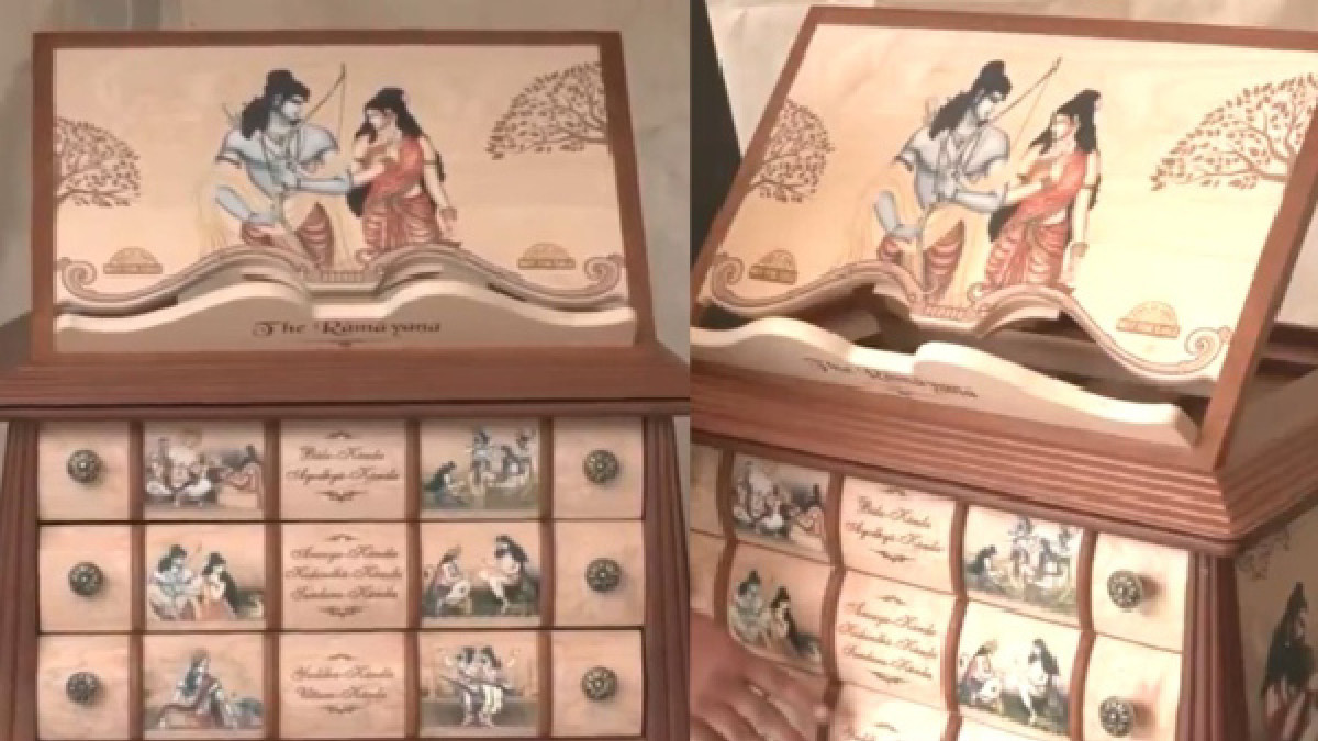 ରାମଲାଲାଙ୍କ ଆଗମନକୁ ନେଇ ସାରା ଅଯୋଧ୍ୟାରେ ସାଜାସଜ୍ୱା କରାଯାଇଛି ଯେଉଁଥି ପାଇଁ ଲୋକେ ମଧ୍ୟ ଖୁବ୍ ଉତ୍ସାହିତ ଅଛନ୍ତି । ବର୍ତ୍ତମାନ 45 କିଲୋଗ୍ରାମର ରାମାୟଣ ଏହି ଅଯୋଧ୍ୟାରେ ଆକର୍ଷଣର କେନ୍ଦ୍ର ପାଲଟିଛି । ଏହି ରାମାୟଣ 3 ଟି ବାକ୍ସରେ ଆସିଛି ଏବଂ ଏହି ରାମାୟଣ ବହୁତ ବିଶେଷ ସାମଗ୍ରୀରେ ପ୍ରସ୍ତୁତ କରାଯାଇଛି । ଏହି ସୁନ୍ଦର ଭାବରେ ପରିକଳ୍ପିତ ରାମାୟଣ ତିନୋଟି ଡ୍ରୟର ବାକ୍ସ ପରି ଦେଖାଯାଉଛି ।