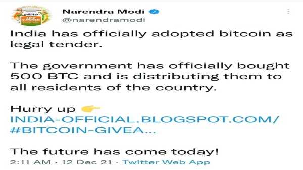 ଶନିବାର ବିଳମ୍ବିତ ରାତିରେ ପିଏମ ମୋଦୀଙ୍କ ଆକାଉଣ୍ଟରୁ ଦୁଇଟି ଟ୍ୱିଟ୍ କରାଯାଇଥିଲା । ପ୍ରଥମ ଟ୍ୱିଟ୍ ରାତି 2:11 ରେ ଆସିଥିଲା ଯେଉଁଥିରେ ଲେଖାଥିଲା ଯେ 'ଭାରତ ସରକାର ବିଟ୍ କଏନ୍ କୁ ଆଇନଗତ ଭାବେ ସ୍ୱୀକୃତି ଦେଇଛନ୍ତି ଏବଂ ସେ ନିଜେ 500 ବିଟ୍ କଏନ୍ କିଣିଛନ୍ତି ଏବଂ ସେ ଲୋକମାନଙ୍କୁ ବିଭାଜନ କରୁଛନ୍ତି । ଏହି ଟ୍ୱିଟ୍ କିଛି ସମୟ ପାଇଁ ଆକାଉଣ୍ଟରେ ରହିଲା ପରେ ଡିଲିଟ୍ ହୋଇଗଲା ।