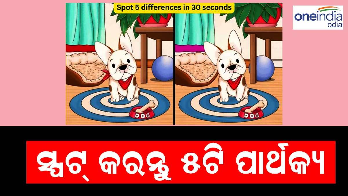 ଉପର ଚିତ୍ରରେ ଦୁଇଟି ସମାନ ଚିତ୍ର ଚିତ୍ରିତ ହୋଇଛି ଯେଉଁଠାରେ ଆପଣ ଏକ ଘରେ ଏକ କୁକୁର ଦେଖିପାରିବେ । ଯଦିଓ ଚିତ୍ରଗୁଡ଼ିକ ପ୍ରାୟ ସମାନ, ସେମାନଙ୍କ ମଧ୍ୟରେ ୫ଟି ପାର୍ଥକ୍ୟ ଅଛି । ଆପଣ ସେଗୁଡିକୁ ୩୦ ସେକେଣ୍ଡରେ ପାଇପାରିବେ କି ?