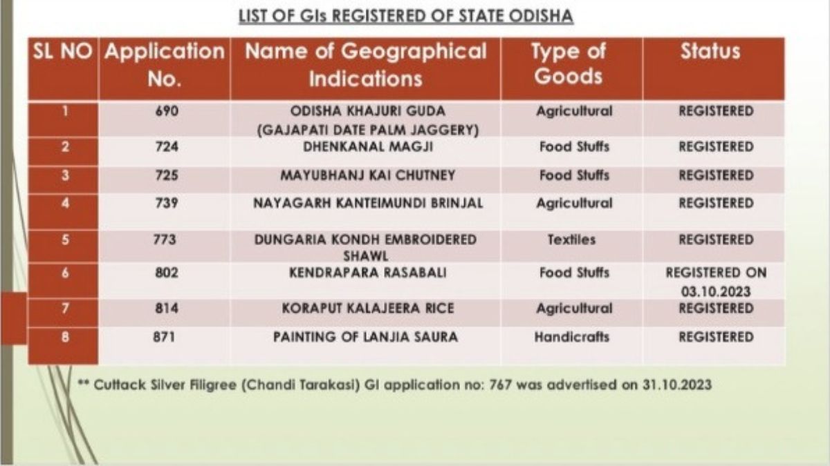 ଏଥିରେ ଖଜୁରୀ ଗୁଡ଼, ମଗଜ ଲଡୁ, କାଇ ଚଟଣୀ, କଣ୍ଟେଇମୁଣ୍ଡି ବାଇଗଣ, ଏମ୍ବ୍ରୋଡରୀ ସାଲ୍, ରସାବଳି, କଳାଜିରା ଧାନ ଓ ସଉରା ଚିତ୍ରକଳାକୁ ଜିଆଇ ଟ୍ୟାଗ ମାନ୍ୟତା ମିଳିଥିବା ଜଣାପଡିଛି ।