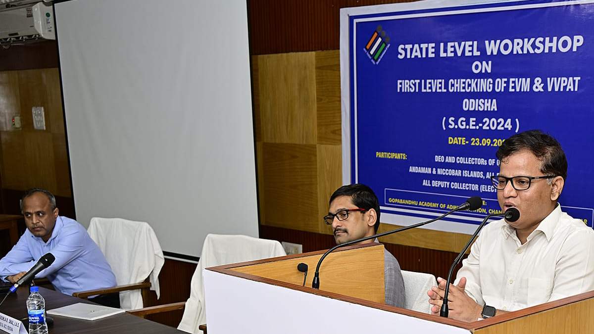 ମୁଖ୍ୟ ନିର୍ବାଚନ ଅଧିକାରୀଙ୍କ କାର୍ଯ୍ୟାଳୟ ଆନୁକୂଲ୍ୟରେ ଭୁବନେଶ୍ୱରସ୍ଥିତ ଗୋପବନ୍ଧୁ ପ୍ରଶାସନିକ ଏକାଡେମୀଠାରେ ରାଜ୍ୟର ସମସ୍ତ ଜିଲ୍ଲାପାଳ, ଅତିରିକ୍ତ ଜିଲ୍ଲାପାଳ ଏବଂ ଡେପୁଟି କଲେକଫରମାନଙ୍କୁ ଇଭିଏମ୍ର ପ୍ରଥମ ପର୍ଯ୍ୟାୟ ତନଖି କାର୍ଯ୍ୟ ସଂପର୍କରେ ଏକ ଦିନିକିଆ କର୍ମଶାଳା ଅନୁଷ୍ଠିତ ହୋଇଯାଇଛି ।