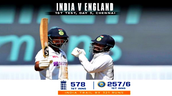 ଚେନ୍ନାଇ: ଓପନିଂ ଅର୍ଡର ଫେଲ ପରେ ଘରୋଇ ଦଳର ପାଳି ସମ୍ଭାଳିଥିଲେ ଅଭିଜ୍ଞ ଚେତଶ୍ବର ପୂଜାର ଓ ଯୁବ ୱିକେଟକିପର ବ୍ୟାଟ୍ସମ୍ୟାନ ଋଷବ ପନ୍ତ । ମାତ୍ର ପନ୍ତ-ପୂଜାର ପାଭେଲିଅନ ଫେରିବା ପରେ ଭ୍ରମଣକାରୀ ଦଳ ନିୟନ୍ତ୍ରଣରେ ଏବେ ଭାରତ ବନାମ ଇଂଲଣ୍ଡ ପ୍ରଥମ ଟେଷ୍ଟ ମ୍ୟାଚ ।